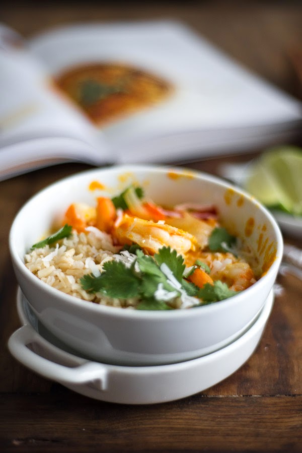 To assemble: Start with rice, add a heaping scoop of moqueca (as much shrimp as you can scoop), sprinkle with farofa and fried coconut, garnish with fresh cilantro and for good measure drizzle a fresh squeeze of lime over the top.